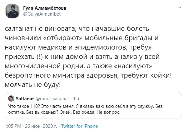 Но, как считает советница мэра Бишкека Азиза Суракматова Гуля Алмамбетова, причина в том, что "начавшие болеть чиновники "отбирают" мобильные бригады и насилуют медиков и эпидемиологов, требуя приехать к ним домой и взять анализ у всей многочисленной родни, а также насилуют безропотного министра здоровья. Требуют койки. Молчать не буду!", - написала Алмамбетова в своем микроблоге в Twitter.