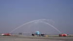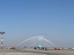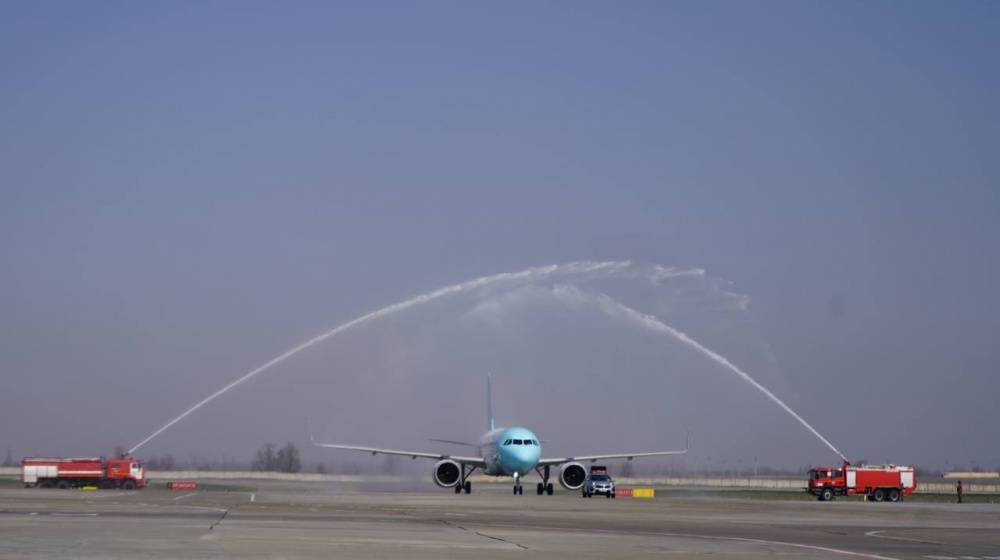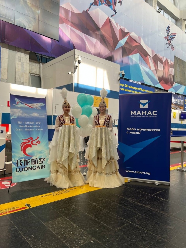 В Международном аэропорту "Манас" 27 марта 2023 года торжественно встретили новый регулярный рейс по маршруту Сиань-Бишкек-Сиань. По традиции воздушное судно встретили водяной аркой.